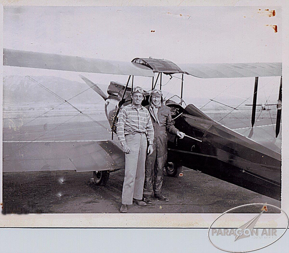 This is Melvin [Lindgren] & Al Newby, standing by Melvin's 31 Curtis Moth. Taken at Belgrade about 1961. The Moth [was] hanging in the Helena Terminal Building [until 2006]. [Source: Lindgren 23 Apr 03]