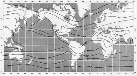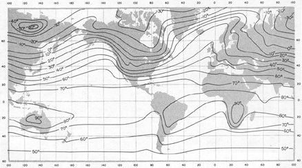 Figure 5. World-wide average surface temperatures in January when the Northern Hemisphere is in the cold season and the Southern Hemisphere is warm. Note that in the Northern Hemisphere, continents are colder than oceanic areas at corresponding latitudes, and in the Southern Hemisphere continents are warmer than oceans.