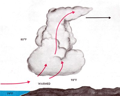 VARIATION WITH LATITUDE The shape of the Earth causes a geographical variation in the angle of incident solar radiation. Since the Earth is essentially spherical, the sun is more nearly overhead in equatorial regions than at higher latitudes. Equatorial regions, therefore, receive the most radiant energy and are warmest. Slanting rays of the sun at higher latitudes deliver less energy over a given area with the least being received at the poles. Thus, temperature varies with latitude from the warm Equator to the cold poles. You can see this average temperature gradient in figures 4 and 5. VARIATIONS WITH TOPOGRAPHY Not related to movement or shape of the earth are temperature variations induced by water and terrain. As stated earlier, water absorbs and radiates energy with less temperature change than does land. Large, deep water bodies tend to minimize temperature changes, while continents favor large changes. Wet soil such as in swamps and marshes is almost as effective as water in suppressing temperature changes. Thick vegetation tends to control temperature changes since it contains some water and also insulates against heat transfer between the ground and the atmosphere. Arid, barren surfaces permit the greatest temperature changes. These topographical influences are both diurnal and seasonal. For example, the difference between a daily maximum and minimum may be 10° or less over water, near a shore line, or over a swamp or marsh, while a difference of 50° or more is common over rocky or sandy deserts. Figures 4 and 5 show the seasonal topographical variation. Note that in the Northern Hemisphere in July, temperatures are warmer over continents than over oceans; in January they are colder over continents than over oceans. The opposite is true in the Southern Hemisphere, but not as pronounced because of more water surface in the Southern Hemisphere. To compare land and water effect on seasonal temperature variation, look at northern Asia and at southern California near San Diego. In the deep continental interior of northern Asia, July average temperature is about 50° F; and January average, about -30° F. Seasonal range is about 80° F. Near San Diego, due to the proximity of the Pacific Ocean, July average is about 70° F and January average, 50° F. Seasonal variation is only about 20° F. Abrupt temperature differences develop along lake and ocean shores. These variations generate pressure differences and local winds which we will study in later chapters. Figure 6 illustrates a possible effect.