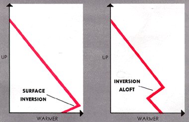 Prevailing wind is also a factor in temperature controls. In an area where prevailing winds are from large water bodies, temperature changes are rather small. Most islands enjoy fairly constant temperatures. On the other hand, temperature changes are more pronounced where prevailing wind is from dry, barren regions. Air transfers heat slowly from the surface upward. Thus, temperature changes aloft are more gradual than at the surface. Let's look at temperature changes with altitude. VARIATION WITH ALTITUDE In chapter 1, we learned that temperature normally decreases with increasing altitude throughout the troposphere. This decrease of temperature with altitude is defined as lapse rate. The average decrease of temperature - average lapse rate - in the troposphere is 2° C per 1,000 feet. But since this is an average, the exact value seldom exists. In fact, temperature sometimes increases with height through a layer. An increase in temperature with altitude is defined as a inversion, i.e., lapse rate is inverted. An inversion often develops near the ground on clear, cool nights when wind is light. The ground radiates and cools much faster than the overlying air. Air in contact with the ground becomes cold while the temperature a few hundred feet above changes very little. Thus, temperature increases with height. Inversions may also occur at any altitude when conditions are favorable. For example, a current of warm air aloft overrunning cold air near the surface produces an inversion aloft. Figure 7 diagrams temperature inversions both surface and aloft. Inversions are common in the stratosphere.