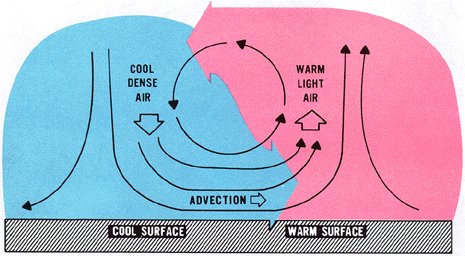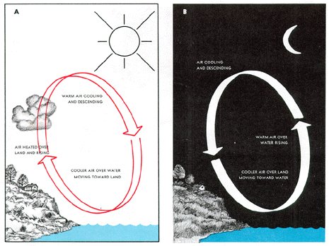 As frequently stated earlier, land surfaces warm and cool more rapidly than do water surfaces; therefore, land is warmer than the sea during the day; winds blows from the cool water to warm land - the "sea breeze" so called because it blows from the sea. At night, the wind reverses, blows from cool land to warmer water, and creates a "land breeze." Figure 30 diagrams land and sea breezes.