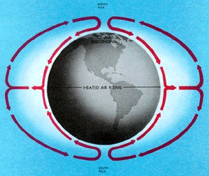 Because of uneven heating of the Earth, surface pressure is low in warm equatorial regions and high in cold polar regions. A pressure gradient develops from the poles to the Equator. If the Earth did not rotate, this pressure gradient force would be the only force acting on the wind. Circulation would be two giant hemispheric convective currents as shown in figure 19. Cold air would sink at the poles; wind would blow straight from the poles to the Equator ; warm air at the Equator would be forced upward; and high level winds would blow directly toward the poles. However, the Earth does rotate; and because of its rotation, this simple circulation is greatly distorted.