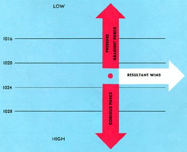 The Coriolis force affects the paths of aircraft; missiles; flying birds; ocean currents; and most important to the study of weather, air currents. The force deflects air to the right in the Northern Hemisphere and to the left in the Southern Hemisphere. This book concentrates mostly on deflection to the right in the Northern Hemisphere. Coriolis force is at a right angle to wind direction and directly proportional to wind speed. That is, as wind speed increases, coriolis force increases. At a given latitude, double the wind speed and you double the coriolis force. Why at a given latitude? Coriolis force varies with latitude from zero at the Equator to a maximum at the poles. It influences wind direction everywhere except immediately at the Equator; but the effects are more pronounced in middle and high latitudes. Remember that the pressure gradient force drives the wind and is perpendicular to isobars. When a pressure gradient force is first established, wind begins to blow from higher to lower pressure directly across the isobars. However, the instant air begins moving, Coriolis force deflects it to the right. Soon the wind is deflected a full 90° and is parallel to the isobars or contours. At this time, Coriolis force exactly balances pressure gradient force as shown in figure 21. With the forces in balance, wind will remain parallel to isobars or contours. Surface friction disrupts this balance as we discuss later; but first let's see how Coriolis force distorts the fictitious global circulation shown in figure 19.