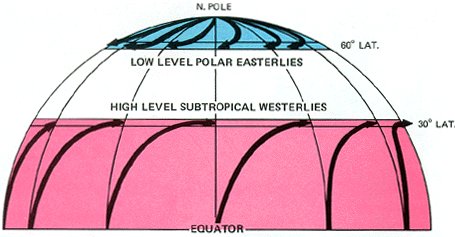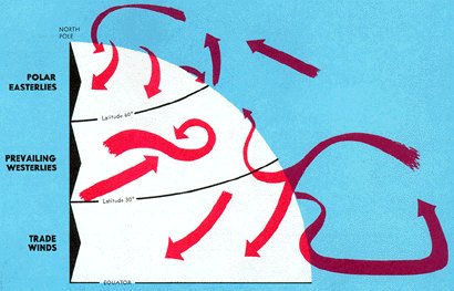 Large masses of cold air break through the northern barrier plunging southward toward the Tropics. Large mid-latitude storms develop between cold outbreaks an carry warm air northward. The result is a mid-latitude band of migratory storms with ever changing weather. Figure 25 is an attempt to standardize this chaotic circulation into an average general circulation.