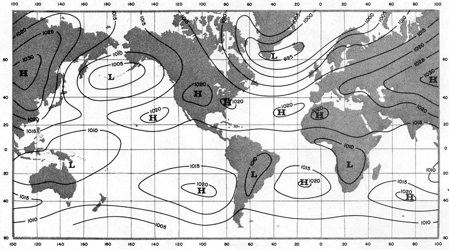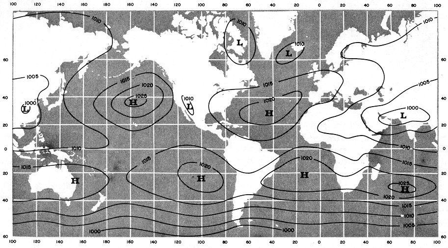 Figure 23. Mean world-wide surface pressure distribution in July. In the warm Northern Hemisphere, warm land areas tend to have low pressure, and cool oceanic areas tend to have high pressure. In the cool Southern Hemisphere, the pattern is reversed; cool land areas tend to have high pressure; and water surfaces, low pressure. However, the relationship is not so evident in the Southern Hemisphere because of relatively small amounts of land. The subtropical high pressure belts are clearly evident at about 30° latitude in both hemispheres. Figure 24. Mean world-wide surface pressure distribution in January. In this season, the pattern in figure 23 is reversed. In the cool Northern Hemisphere, cold continental areas are predominantly areas of high pressure while warm oceans tend to be low pressure areas. In the warm Southern Hemisphere, land ares tend to have low pressure; and oceans, high pressure. The subtropical high pressure belts are evident in both hemispheres. Note that the pressure belts shift southward in January and northward in July with the shift in the zone of maximum heating.