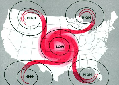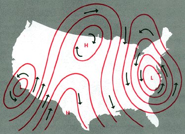 Figure 28. Circulation around pressure systems at the surface. Wind spirals outward from high pressure and inward to low pressure, crossing isobars at an angle.