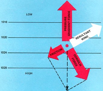As frictional force slows the windspeed, Coriolis force decreases. However, friction does not affect pressure gradient force. Pressure gradient and Coriolis forces are no longer in balance. The stronger pressure gradient force turns the wind at an angle across the isobars toward lower pressure until the three forces balance as shown in figure 27. Frictional and Coriolis forces combine to just balance pressure gradient force. Figure 28 shows how surface wind spirals outward from high pressure into low pressure crossing isobars at an angle.