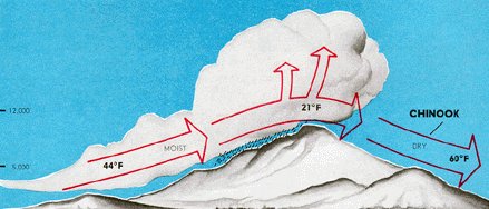 MOUNTAIN AND VALLEY WINDS In the daytime, air next to a mountain slope is heated by contact with the ground as it receives radiation from the sun. This air usually becomes warmer than air at the same altitude but farther from the slope. Colder, denser air in the surroundings settles downward and forces the warmer air near the ground up the mountain slope. This wind is a "valley wind" so called because the air is flowing up out of the valley. At night, the air in contact with the mountain slope is cooled by terrestrial radiation and becomes heavier than the surrounding air. It sinks along the slope, producing the "mountain wind" which flows like water down the mountain slope. Mountain winds are usually stronger than valley winds, especially in winter. The mountain wind often continues down the more gentle slopes of canyons and valleys, and in such cases takes the name "drainage wind." It can become quite strong over some terrain conditions and in extreme cases can become hazardous when flowing through canyon restrictions as discussed in chapter 9. A katabatic wind is any wind blowing down an incline when the incline is influential in causing the wind. Thus, the mountain wind is a katabatic wind. Any katabatic wind originates because, cold, heavy air spills down sloping terrain displacing warmer, less dense air ahead of it. Air is heated and dried as it flows down slope as we will study in later chapters. Sometimes the descending air becomes warmer than the air it replaces. Many katabatic winds recurring in local areas have been given colorful names to highlight their dramatic, local effect. Some of these are the Bora, a cold northerly wind blowing from the Alps to the Mediterranean coast; the Chinook, figure 29, a warm wind down the east slope of the Rocky Mountains often reaching hundreds of miles into the high plains; the Taku, a cold wind in Alaska blowing off the Taku glacier; and the Santa Ana, a warm wind descending from the Sierras into the Santa Ana Valley of California.