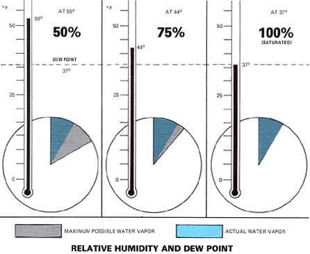 Figure 33. Relative humidity depends on both temperature and water vapor. In this figure, water vapor is constant but temperature varies. On the left, relative humidity is 50%; the warmer air could hold twice as much water vapor as is actually present. As the air cools, center and right, relative humidity increases. As the air cools to 37°F, its capacity to hold water vapor is reduced to the amount actually present. Relative humidity is 100% and the air is now "saturated." Note that at 100% humidity, temperature and dew point are the same. The air cooled to saturation, i.e., it cooled to the dew point.