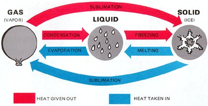 Any change of state involves a heat transaction with no change in temperature. Figure 35 diagrams the heat exchanges between the different states. Evaporation requires heat energy that comes from the nearest available heat source. This heat energy is known as the "latent heat of vaporization," and its removal cools the source it comes from. An example is the cooling of your body by evaporation of perspiration.