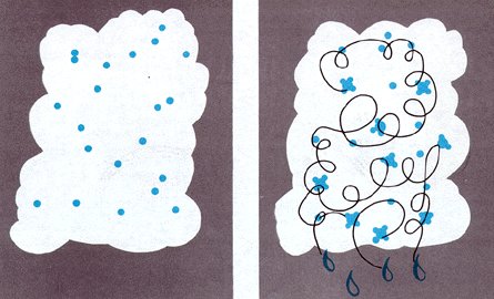 PARTICLE GROWTH Once a water droplet or ice crystal forms, it continues to grow by added condensation or sublimation directly onto the particle. This is the slower of the two methods and usually results in drizzle or very light rain or snow. Cloud particles collide and merge into a larger drop in the more rapid growth process. This process produces larger precipitation particles and does so more rapidly than the simple condensation growth process. Upward currents enhance the growth rate and also support larger drops as shown in figure 36. Precipitation formed by merging drops with mild upward currents can produce light to moderate rain and snow. Strong upward currents support the largest drops and build clouds to great heights. They can produce heavy rain, heavy snow, and hail.
