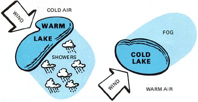 In winter, cold air frequently moves over relatively warm lakes. The warm water adds heat and water vapor to the air causing showers to the lee of the lakes. In other seasons, the air may be warmer than the lakes. When this occurs, the air may become saturated by evaporation from the water while also becoming cooler in the low levels by contact with the cool water. Fog often becomes extensive and dense to the lee of a lake. Figure 37 illustrates movement of air over both warm and cold lakes. Strong cold winds across the Great Lakes often carry precipitation to the Appalachians as shown in figure 38.