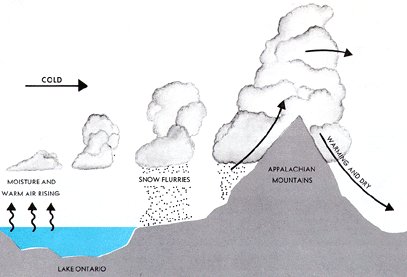 Figure 38. Strong cold winds across the Great Lake absorb water vapor and may carry showers as far eastward as the Appalachians.