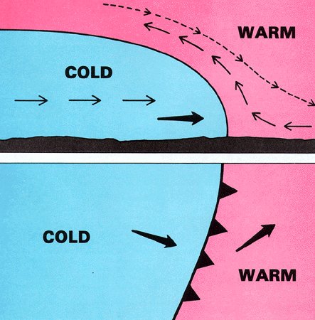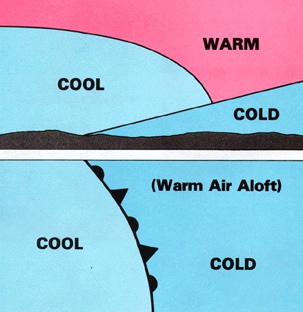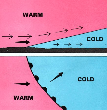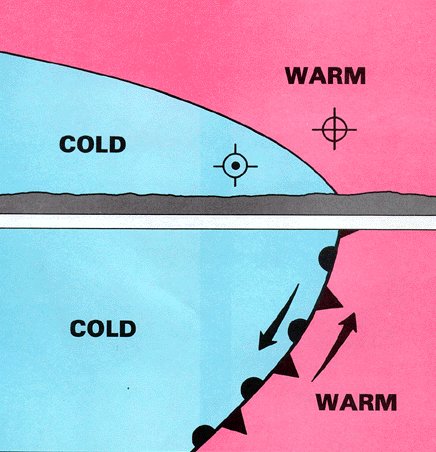 When you pass through a front, the change from the properties of one air mass to those of the other is sometimes quite abrupt. Abrupt changes indicate a narrow frontal zone. At other times, the change of properties is very gradual indicating a broad and diffuse frontal zone. Temperature Temperature is one of the most easily recognized discontinuities across a front. At the surface, the passage of a front usually causes noticeable temperature change. When flying through a front, you note a significant change in temperature, especially at low altitudes. Remember that the temperature change, even when gradual, is faster and more pronounced than a change during a flight wholly within one air mass. Thus, for safety, obtain a new altimeter setting after flying through a front. Chapter 3 discussed the effect of a temperature change on the aircraft altimeter. Dew Point As you learned in Chapter 5, dew point temperature is a measure of the amount of water vapor in the air. Temperature-dew point spread is a measure of the degree of saturation. Dew point and temperature-dew point spread usually differ across a front. The difference helps identify the front and may give a clue to differences of cloudiness and/or fog. Wind Wind always changes across a front. Wind discontinuity may be in direction, in speed, or in both. Be alert for a wind shift when flying in the vicinity of a frontal surface; if the wind shift catches you unaware it can get you off course or even lost in a short time. The relatively sudden change in wind also creates wind shear, and you will study its significance in the next chapter, "Turbulence." Pressure A front lies in a pressure trough, and pressure generally is higher in the cold air. Thus, when you cross a front directly into colder air, pressure usually rises abruptly. When you approach a front toward warm air, pressure generally falls until you cross the front and then remains steady or falls slightly in the warm air. However, pressure patterns vary widely across fronts, and your course may not be directly across a front. The important thing to remember is that when crossing a front, you will encounter a difference in the rate of pressure change; be especially alert in keeping your altimeter setting current. TYPES OF FRONTS The three principal types of fronts are the cold front, the warm front, and the stationary front. Cold Front The leading edge of an advancing cold air mass is a cold front. At the surface, cold air is overtaking and replacing warmer air. Cold fronts move at about the speed of the wind component perpendicular to the front just above the frictional layer. Figure 59 shows the vertical cross section of a cold front and the symbol depicting it on a surface weather chart. A shallow cold air mass or a slow moving cold front may have a frontal slope more like a warm front shown in figure 60.