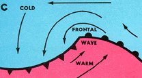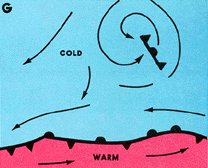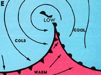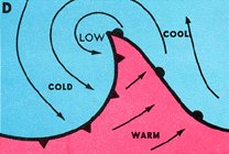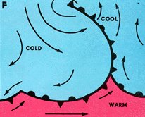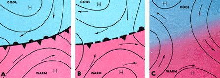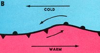 Frontal waves and cyclones (areas of low pressure) usually form on slow moving cold fronts or on stationary fronts. The life cycle and movement of a cyclone is dictated to a great extent by the upper wind flow. In the initial condition of frontal wave development in figure 62, the winds on both sides of the front are blowing parallel to the front (A). Small disturbances then may start a wavelike bend in the front (B).