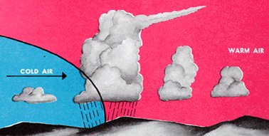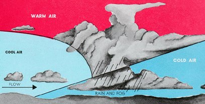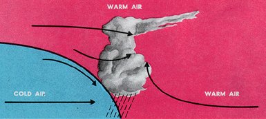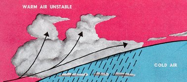Figure 68. A cold front underrunning warm, moist, unstable air. Clouds are cumuliform with possible showers or thunderstorms near the surface position of the front. Convective clouds often develop in the warm air ahead of the front. The warm, wet ground behind the front generates low-level convection and fair weather cumulus in the cold air.