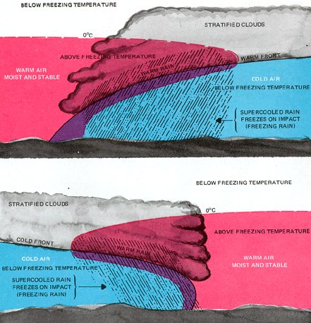 FRONTS A condition favorable for rapid accumulation of clear icing is freezing rain below a frontal surface. Rain forms above the frontal surface at temperatures warmer than freezing. Subsequently, it falls through air at temperatures below freezing and becomes supercooled. The supercooled drops freeze on impact with an aircraft surface. Figure 98 diagrams this type of icing. It may occur with either a warm front (top) or a cold front. The icing can be critical because of the large amount of supercooled water. Icing can also become serious in cumulonimbus clouds along a surface cold front, along a squall line, or embedded in the cloud shield of a warm front.