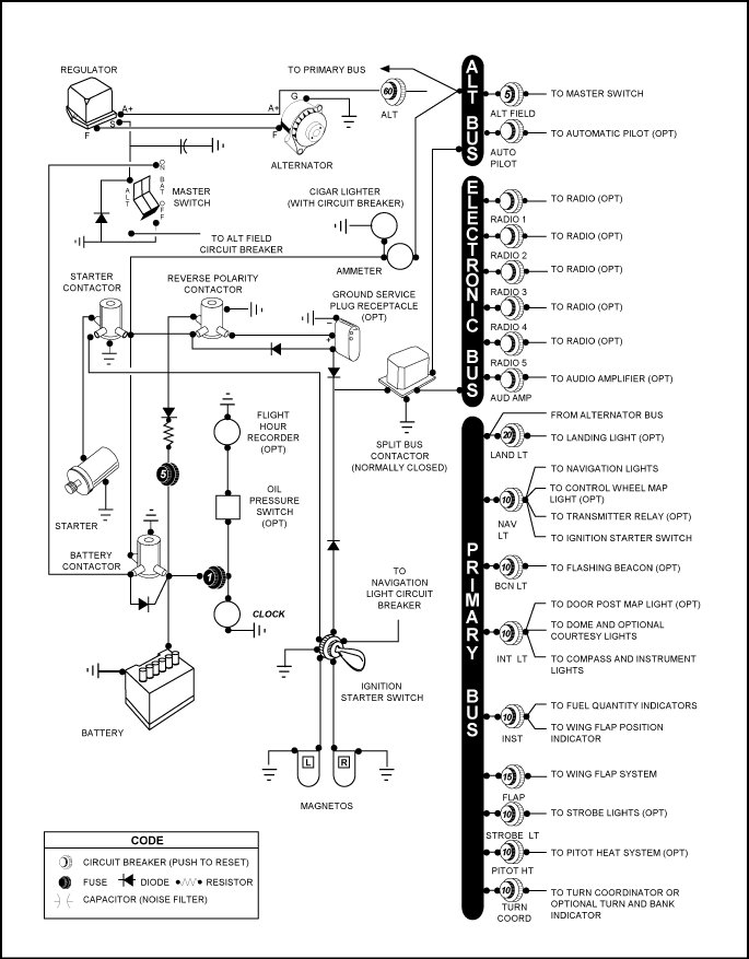 Engine-driven alternators or generators supply electric current to the electrical system and also maintain a sufficient electrical charge in the battery which is used primarily for starting. There are several basic differences between alternators and generators. Most generators will not produce a sufficient amount of electrical current at low engine revolutions per minute (RPM) to operate the entire electrical system. Therefore, during operations at low engine RPM's, the electrical needs must be drawn from the battery, which in a short time may be depleted. An alternator, however, produces a sufficient amount of electrical current at slower engine speeds by first producing alternating current which is converted to direct current. Another advantage is that the electrical output of an alternator is more constant throughout the ranges of engine speeds. Alternators are also lighter in weight, less expensive to maintain, and less prone to become overloaded during conditions of heavy electrical loads. Electrical energy stored in a battery provides a source of electricity for starting the engine and a limited supply of electricity for use in the event the alternator or generator fails. Some airplanes are equipped with receptacles to which external auxiliary power units (APU) can be connected to provide electrical energy for starting. These are very useful, especially during cold weather starting. Care must be exercised in starting engines using an APU. A master switch is installed on airplanes to provide a means for the pilot to turn the electrical system "on" and "off." Turning the master switch "on" provides electrical energy to all the electrical equipment circuits with the exception of the ignition system. Although additional electrical equipment may be found in some airplanes, the following lists the equipment most commonly found which uses the electrical system for its source of energy: