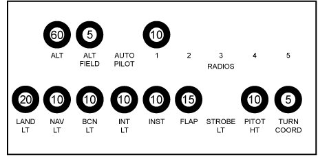 Fuses or circuit breakers are used in the electrical system to protect the circuits and equipment from electrical overload. Spare fuses of the proper amperage limit should be carried in the airplane to replace defective or blown fuses. Circuit breakers have the same function as a fuse but can be manually reset, rather than replaced, if an overload condition occurs in the electrical system. Placards at the fuse or circuit breaker location identify the circuit by name and show the amperage limit. [Figure 2-3] An ammeter is an instrument used to monitor the performance of the airplane electrical system. Not all airplanes are equipped with an ammeter. Some are equipped with a light which, when lighted, indicates a discharge in the system as a generator/alternator malfunction.