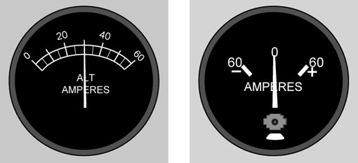 An ammeter shows if the alternator/generator is producing an adequate supply of electrical power to the system by measuring the amperes of electricity. This instrument also indicates whether the battery is receiving an electrical charge. The face of some ammeters is designed with a zero point in the upper center of the dial and a plus value to the right of center; a negative value is to the left. A vertical needle swings to the right or left, depending upon the performance of the electrical system. If the needle indicates a plus value, it means that the battery is being charged. After power is drawn from the battery for starting, the needle will indicate a noticeable plus charge value for a short period of time, and then stabilize to a lower plus charge value. [Figure 2-4]