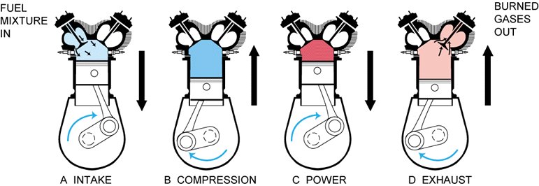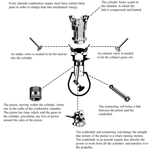 How an Engine Operates Most light airplane engines are internal combustion of the reciprocating type which operate on the same principle as automobile engines. They are called reciprocating engines because certain parts move back and forth in contrast to a circular motion such as a turbine. Some smaller airplanes are equipped with turbine engines, but this type will not be discussed in this handbook. As shown in figure 2-5, the reciprocating engine consists of cylinders, pistons, connecting rods, and a crankshaft. One end of a connecting rod is attached to a piston and the other end to the crankshaft. This connecting rod converts the straight-line motion of the piston to the rotary motion of the crankshaft, which turns the propeller. At the closed end of the cylinder, there are normally two spark plugs which ignite the fuel, and two openings over which valves open and close. One valve (the intake valve) when open admits the mixture of fuel and air, and the other (the exhaust valve) when open permits the burned gases to escape. For the engine to complete one cycle, the piston must complete four strokes. This requires two revolutions of the crankshaft. The four strokes are the intake, compression, power, and exhaust. The following describes one cycle of engine operation.