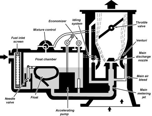 The fuel/air mixture is then drawn through the intake manifold and into the combustion chambers where it is ignited. The "float-type carburetor" acquires its name from a float which rests on fuel within the float chamber. A needle attached to the float opens and closes an opening in the fuel line. This meters the correct amount of fuel into the carburetor, depending upon the position of the float, which is controlled by the level of fuel in the float chamber. When the level of the fuel forces the float to rise, the needle closes the fuel opening and shuts off the fuel flow to the carburetor. It opens when the engine requires additional fuel. Mixture Control A "mixture control" in the cockpit is provided to change the fuel flow to the engine to compensate for varying air densities as the airplane changes altitude. Carburetors are normally calibrated at sea level pressure to meter the correct amount of fuel with the mixture control in a "full rich" position. As altitude increases, air density decreases. This means that a given volume of air does not weigh as much at higher altitudes because it does not contain as many air molecules. As altitude increases, the weight of air decreases, even though the volume of air entering the carburetor remains the same. To compensate for this difference, the mixture control is used to adjust the ratio of fuel-to-air mixture entering the combustion chamber. This also regulates fuel consumption. If the fuel/air mixture is too rich, i.e., too much fuel in terms of the weight of air, excessive fuel consumption, rough engine operation, and appreciable loss of power will occur. Because of excessive fuel, a cooling effect takes place which causes below normal temperatures in the combustion chambers. This cooling results in spark plug fouling. Conversely, operation with an excessively lean mixture, i.e., too little fuel in terms of the weight of air, will result in rough engine operation, detonation, overheating, and a loss of power. To summarize, as the airplane climbs and the atmospheric pressure decreases, there is a corresponding decrease in the weight of air passing through the induction system. The volume of air, however, remains constant, and since it is the volume of airflow which determines the pressure drop at the throat of the venturi, the carburetor tends to meter the same amount of fuel to this thin air as to the dense air at sea level. Therefore, the mixture becomes richer as the airplane gains altitude. The mixture control prevents this by decreasing the rate of fuel discharge to compensate for the decrease in air density. However, the mixture must be enriched when descending from altitude. Follow the manufacturer's recommendation for the particular airplane being flown to determine the proper leaning/enriching procedures. Carburetor Icing The vaporization of fuel, combined with the expansion of air as it flows through the carburetor, causes a sudden cooling of the mixture. The temperature of the air passing through the carburetor may drop significantly within a fraction of a second. Water vapor in the air is "squeezed out" by this cooling and, if the temperature in the carburetor reaches 0° C (32° F) or below, the moisture will be deposited as frost or ice inside the carburetor passages. Even a slight accumulation of this deposit will reduce power and may lead to complete engine failure, particularly when the throttle is partly or fully closed. [Figure 2-8] Conditions Conducive to Carburetor Icing On dry days, or when the temperature is well below freezing, the moisture in the air is not generally enough to cause trouble. But if the temperature is between -7° C (20° F) and 21° C (70° F), with visible moisture or high humidity, the pilot should be constantly on the alert for carburetor ice. During low or closed throttle settings, an engine is particularly susceptible to carburetor icing.