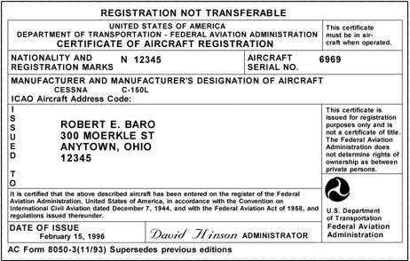 Certificate of Aircraft Registration Before an aircraft can be legally flown, it must be registered with the FAA Civil Aviation Registry and have within it a Certificate of Aircraft Registration issued to the owner as evidence of the registration. [Figure 2-13] The Certificate of Aircraft Registration will expire when: