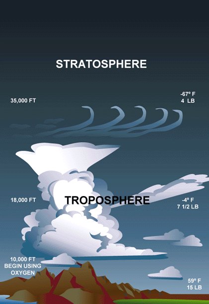 Abbreviated Briefing An abbreviated briefing will be provided at the user's request to supplement mass disseminated data, to update a previous briefing, or to request specific information only. Outlook Briefing An outlook briefing will be provided when the briefing is 6 or more hours in advance of the proposed departure time. It will be limited to applicable forecast data for the proposed flight. NATURE OF THE ATMOSPHERE Life exists at the bottom of an ocean of air called the atmosphere. This ocean extends upward from the Earth's surface for many miles, gradually thinning as it nears the top. Near the surface, the air is relatively warm from contact with the Earth. The temperature in the United States averages about 15° C (59° F) the year round. As altitude increases, the temperature decreases by about 2° C (3.5° F) for every 1,000 feet (normal lapse rate) until air temperature reaches about –55° C (–67° F) at 7 miles above the Earth. For flight purposes, the atmosphere is divided into two layers: the upper layer, where temperature remains practically constant, is the " stratosphere;" the lower layer, where the temperature changes, is the "troposphere." Although jets routinely fly in the stratosphere, the private pilot usually has no occasion to go that high, but usually remains in the lower layer-the troposphere. This is the region where all weather occurs and practically all light airplane flying is done. The top of the troposphere lies 5 to 10 miles above the Earth's surface. [Figure 5-1] Obviously, a body of air as deep as the atmosphere has tremendous weight. It is difficult to realize that the normal sea level pressure upon the body is about 15 pounds per square inch, or about 20 tons on the average person. The body does not collapse because this pressure is equalized by an equal pressure within the body. In fact, if the pressure were suddenly released, the human body would explode. As altitude is gained, the temperature of the air not only decreases (it is usually freezing above 18,000 feet) but the air density also decreases; therefore there is less pressure. Pressure is rapidly reduced up to 18,000 feet where the pressure is only half as great as at sea level.