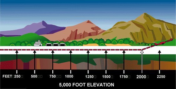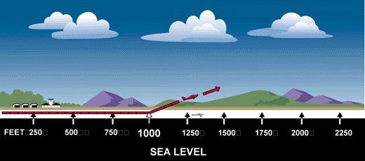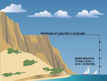 Oxygen and the Human Body The atmosphere is composed of about four-fifths nitrogen and one-fifth oxygen, with approximately one percent of various other gases. Oxygen is essential to human life. At 18,000 feet, with only half the normal atmospheric pressure, the body intake of oxygen would be only half the normal amount. Body reactions would be definitely below normal, and unconsciousness might result. In fact, the average person's reactions become affected at 10,000 feet and may be affected at altitudes as low as 5,000 feet. To overcome these unfavorable conditions at high altitudes, pilots use oxygen-breathing equipment and wear protective clothing, or fly in pressurized cabins in which temperature, pressure, and oxygen content of the air can be maintained within proper range. Significance of Atmospheric Pressure The average pressure exerted by the atmosphere is approximately 15 pounds per square inch at sea level. This means that a column of air 1 inch square extending from sea level to the top of the atmosphere would weight about 15 pounds. The actual pressure at a given place and time, however, depends upon several factors. These are altitude, temperature, and density of the air. These conditions definitely affect flight. Measurement of Atmospheric Pressure A barometer is generally used to measure the height of a column of mercury in a glass tube. It is sealed at one end and calibrated in inches. An increase in pressure forces the mercury higher in the tube; a decrease allows some of the mercury to drain out, reducing the height of the column. In this way, changes of pressure are registered in inches of mercury (in. Hg.). The standard sea level pressure expressed in these terms is 29.92 inches at a standard temperature of 15° C (59° F). The mercury barometer is cumbersome to move and difficult to read. A more compact, more easily read, and more mobile barometer is the aneroid, although it is not so accurate as the mercurial. The aneroid barometer is a partially evacuated cell sensitive to pressure changes. The cell is linked to an indicator which moves across a scale graduated in pressure units. If all weather stations were at sea level, the barometer readings would give a correct record of the distribution of atmospheric pressure at a common level. To achieve a common level, each station translates its barometer reading into terms of sea level pressure. A change of 1,000 feet of elevation makes a change of about 1 inch on the barometer reading. Thus, if a station located 5,000 feet above sea level found the mercury to be 25 inches high in the barometer tube, it would translate and report this reading as 30 inches. [Figure 5-2] Since the rate of decrease in atmospheric pressure is fairly constant in the lower layers of the atmosphere, the approximate altitude can be determined by finding the difference between pressure at sea level and pressure at the given atmospheric level. In fact, the aircraft altimeter is an aneroid barometer with its scale in units of altitude instead of pressure. Effect of Altitude on Atmospheric Pressure It can be concluded that atmospheric pressure decreases as altitude increases. It can also be stated that pressure at a given point is a measure of the weight of the column of air above that point. As altitude increases, pressure diminishes as the weight of the air column decreases. This decrease in pressure (increase in density altitude) has a pronounced effect on flight. Effect of Altitude on Flight The most noticeable effect of a decrease in pressure, due to an altitude increase, becomes evident in takeoffs, rate of climb, and landings. An airplane that requires a 1,000-foot run for takeoff at a sea level airport will require a run almost twice as long to take off at an airport which is approximately 5,000 feet above sea level. The purpose of a takeoff run is to gain enough speed to generate lift from the passage of air over the wings. If the air is thin, more speed is required to obtain enough lift for takeoff -- hence, a longer ground run. It is also true that the engine is less efficient in thin air, and the thrust of the propeller is less effective. The rate of climb is also slower at the higher elevation, requiring a greater distance to gain the altitude necessary to clear any obstructions. In landing, the difference is not so noticeable except that the plane has greater groundspeed when it touches the ground. [Figures 5-3 and 5-4]