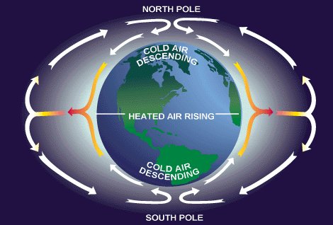 Effect of Differences in Air Density Differences in air density caused by changes in temperature result in changes in pressure. This, in turn, creates motion in the atmosphere, both vertically and horizontally (current and winds). This action, when mixed with moisture, produces clouds and precipitation - in fact, these are the phenomena called weather. Pressure Recorded in Millibars The mercury barometer reading at the individual weather stations is converted to the equivalent sea level pressure and then translated from terms of inches of mercury to a measure of pressure called millibars. One inch of mercury is equivalent to approximately 34 millibars; hence, the normal atmospheric pressure at sea level (29.92), expressed in millibars, is 1,013.2 or roughly 1,000 millibars. The usual pressure readings range from 950.0 to 1,040.0. Individually these pressure readings are of no particular value to the pilot; but when pressures at different stations are compared, or when pressures at the same station show changes in successive readings, it is possible to determine many symptoms indicating the trend of weather conditions. In general, a falling pressure indicates the approach of bad weather and a rising pressure indicates a clearing of the weather. Wind The pressure and temperature changes discussed in the previous section produce two kinds of motion in the atmosphere - vertical movement of ascending and descending currents, and horizontal flow known as wind. Both of these motions are of primary interest to the pilot because they affect the flight of aircraft during takeoff, landing, climbing, and cruising flight. These motions also bring about changes in weather, which require a pilot to determine if a flight can be made safely. Conditions of wind and weather occurring at any specific place and time are the result of the general circulation in the atmosphere. This will be discussed briefly in the following pages. The atmosphere tends to maintain an equal pressure over the entire Earth, just as the ocean tends to maintain a constant level. When the equilibrium is disturbed, air begins to flow from areas of higher pressure to areas of lower pressure. The cause of atmospheric circulation The factor that upsets the normal equilibrium is the uneven heating of the Earth. At the Equator, the Earth receives more heat than in areas to the north and south. This heat is transferred to the atmosphere, warming the air and causing it to expand and become less dense. Colder air to the north and south, being more dense, moves toward the Equator forcing the less dense air upward. This air in turn becomes warmer and less dense and is forced upward, thus establishing a constant circulation that might consist of two circular paths; the air rising at the Equator, traveling aloft toward the poles, and returning along the Earth's surface to the Equator, as shown in figure 5-5.