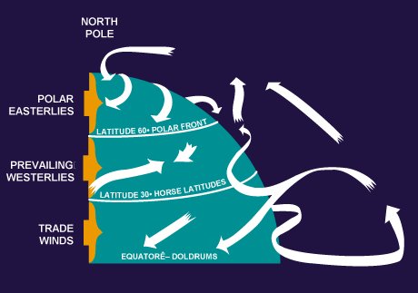 This theoretical pattern, however, is greatly modified by many forces, a very important one being the rotation of the Earth. In the Northern Hemisphere, this rotation causes air to deflect to the right of its normal path. In the Southern Hemisphere, air is deflected to the left of its normal path. For simplicity, this discussion will be confined to the motion of air in the Northern Hemisphere. [Figure 5-6]