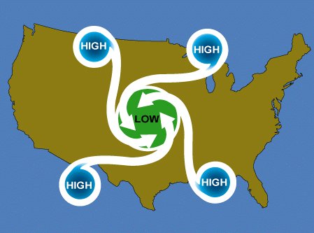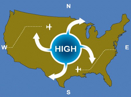 If, however, through the lack of better judgment the flight was continued toward the approaching cold front, a few altostratus clouds and a dark layer of nimbostratus lying low on the horizon, with perhaps cumulonimbus in the background would be noted. Two courses would now be open: (1) either turn around and outdistance the storm, or (2) make an immediate landing which might be extremely dangerous because of gusty wind and sudden wind shifts. If flight was continued, entrapment in a line of squalls and cumulonimbus clouds could occur. It may be unsafe to fly beneath these clouds; impossible, in a small plane, to fly above them. At low altitudes, there are no safe passages through them. Usually there is no possibility of flying around them because they often extend in a line for 300 to 500 miles. Comparison of Cold Fronts with Warm Fronts The slope of a cold front is much steeper than that of a warm front and the progress is generally more rapid -- usually from 20 to 35 MPH -- although in extreme cases, cold fronts have been known to move at 60 MPH. Weather activity is more violent and usually takes place directly at the front instead of in advance of the front. In late afternoon during the warm season, however, squall lines frequently develop as much as 50 to 200 miles in advance of the actual cold front. Whereas warm front dangers are low ceilings and visibilities, and cold front dangers are chiefly sudden storms, high and gusty winds, and turbulence. Unlike the warm front, the cold front rushes in almost unannounced, makes a complete change in the weather within a period of a few hours, and then continues. Altostratus clouds sometimes form slightly ahead of the front, but these are seldom more than 100 miles in advance. After the front has passed, the weather often clears rapidly and cooler, drier air with usually unlimited ceilings and visibilities prevail. Wind Shifts Wind shifts perhaps require further explanation. The wind in a "high" blows in a clockwise spiral. When two highs are adjacent, the winds are in almost direct opposition at the point of contact as illustrated in figure 5-24. Since fronts normally lie between two areas of higher pressure, wind shifts occur in all types of fronts, but they usually are more pronounced in cold fronts.