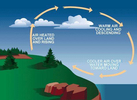 Convection Currents Certain kinds of surfaces are more effective than others in heating the air directly above them. Plowed ground, sand, rocks, and barren land give off a great deal of heat, whereas water and vegetation tend to absorb and retain heat. The uneven heating of the air causes small local circulations called "convection currents," which are similar to the general circulation just described. This may be particularly noticeable over land adjacent to a body of water. During the day, air over land becomes heated and less dense; colder air over water moves in to replace it forcing the warm air aloft and causing an on-shore wind. At night, the land cools, and the water is relatively warmer. The cool air over the land, being heavier, then moves toward the water as an off-shore wind, lifting the warmer air and reversing the circulation. [Figures 5-9 and 5-10] Convection currents cause the bumpiness experienced by pilots flying at low altitudes in warmer weather. On a low flight over varying surfaces, the pilot will encounter updrafts over pavement or barren places and downdraft over vegetation and water. Ordinarily, this can be avoided by flight at higher altitudes. When the larger convection currents form cumulus clouds, the pilot will invariably find smooth air above the cloud level. [Figure 5-11]