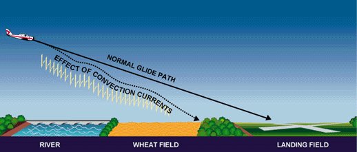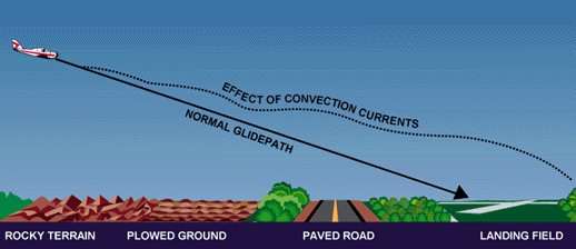 Convection currents also cause difficulty in making landings, since they affect the rate of descent. For example, a pilot flying a normal glide frequently tends to land short of or overshoot the intended landing spot, depending upon the presence and severity of convection currents. [Figures 5-12 and 5-13]