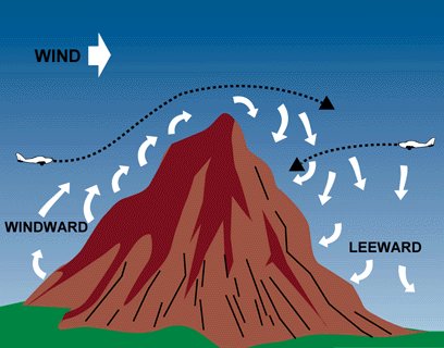 Figure 5-15. -- Airplanes approaching hills or mountains from windward are helped by rising currents. Those approaching from leeward encounter descending currents.