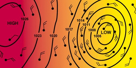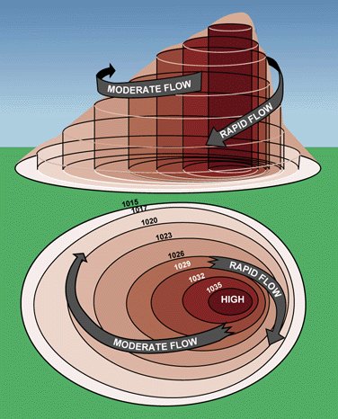 Windspeed is shown by "barbs" and/or "pennants" placed on the end of the arrow. The speed is indicated by the number of half barbs, full barbs, or pennants. Each half barb represents approximately 5 knots, each full barb indicates approximately 10 knots, and each pennant 50 knots. Thus two and one-half barbs indicate a windspeed of approximately 25 knots; a pennant and two and one-half barbs indicate a windspeed of approximately 75 knots, etc. The pilot can thus tell at a glance, the wind conditions prevailing at map time at any weather station. Pilots can obtain this information and forecasts of expected winds from all weather reporting stations. The pressure at each station is recorded on the weather map, and lines (isobars) are drawn to connect points of equal pressure. Many of the lines make complete circles to surround pressure areas marked "H" (high) or "L" (low). Isobars are quite similar to the contour lines appearing on aeronautical charts. However, instead of indicating altitude of terrain and steepness of slopes, isobars indicate the amount of pressure and steepness of pressure gradients. If the gradient (slope) is steep, the isobars will be close together, and the wind will be strong. If the gradient is gradual, the isobars will be far apart, and the wind gentle. [Figure 5-17] Isobars furnish valuable information about winds in the first few thousand feet above the surface. Close to the Earth, wind direction is modified by the contours over which it passes, and windspeed is reduced by friction with the surface. At levels 2,000 or 3,000 feet above the surface, however, the speed is greater and the direction is usually parallel to the isobars. Thus, while wind arrows on the weather map excerpt indicate wind near the surface, isobars indicate winds at slightly higher levels. [Figure 5-16] In the absence of specific information on upper wind conditions, the pilot can often make a fairly reasonable estimate of the wind conditions in the lower few thousand feet on the basis of the observed surface wind. Generally, it will be found that the wind at an altitude of 2,000 feet above the surface will veer about 20° to 40° to the right and almost double in speed. The veering will be greatest over rough terrain and least over flat surfaces. Thus, a north wind of 20 knots at the airport would be likely to change to a northeast wind of 40 knots at 2,000 feet. This subject will be reviewed later in this chapter.