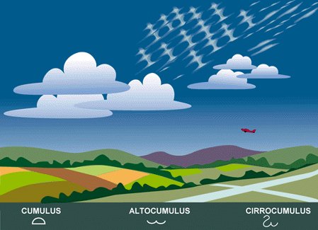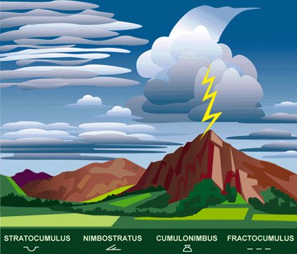 The clouds in the alto group are not normally encountered in flights of smaller planes, but they sometimes contain icing conditions important for commercial and military planes. Altostratus clouds usually indicate that unfavorable flying weather is near. The low clouds are of great importance to the pilot because they create low ceilings and low visibility. They change rapidly, and frequently drop to the ground, forming a complete blanket over landmarks and landing fields. In temperatures near freezing, they are a constant threat because of the probability of icing. The pilot should be constantly alert to any changes in conditions, and be prepared to land before visibility lowers to the point where objects are suddenly obscured. Cumulus clouds vary in size from light scud or fluffy powder puffs to towering masses rising thousands of feet in the sky. Usually they are somewhat scattered, and the pilot can fly around them without difficulty. Under some conditions, particularly in the late afternoon, they are likely to multiply, flatten out, and cover the sky. Cumulonimbus clouds are very dangerous. When they appear individually or in small groups, they are usually of the type called air mass thunderstorms (caused by heating of the air at the Earth's surface) or orographic thunderstorms (caused by the upslope motion of air in mountainous regions). On the other hand, when these clouds take the form of a continuous or almost continuous line, they are usually caused by a front or squall line. The most common position for a squall line is in advance of a cold front, but one can form in air far removed from a front. Since cumulonimbus clouds are formed by rising air currents, they are extremely turbulent; moreover, it is possible for an airplane flying nearby to be drawn into the cloud. Once inside, an airplane may encounter updrafts and downdrafts with velocities of 3,000 feet per minute or greater. Airplanes have been torn apart by the violence of these currents. In addition, the clouds frequently contain large hailstones capable of severely damaging aircraft, lightning, and great quantities of water at temperatures conducive to heavy icing. The only practical procedure for a pilot caught within a thunderstorm is to reduce airspeed. A recommended safe speed for an airplane flying through turbulence is an airspeed which provides a safe margin above the stall speed, but not greater than the maneuvering speed for the particular airplane.