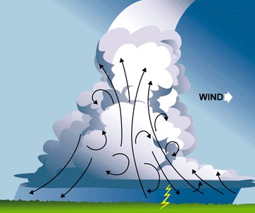Figure 5-21 shows the important characteristics of a typical cumulonimbus cloud. The top of the cloud flattens into an anvil shape, which points in the direction the cloud is moving, generally with the prevailing wind. Near the base, however, the winds blow directly toward the cloud and increase in speed, becoming violent updrafts as they reach the low rolls at the forward edge. Within the cloud and directly beneath it are updrafts and downdrafts. In the rear portion is a strong downdraft which becomes a wind blowing away from the cloud. The cloud is a storm factory. The updrafts quickly lift the moist air to its saturation point, whereupon it condenses and raindrops begin to fall. Before these have reached the bottom of the cloud, updrafts pick them up and carry them aloft, where they may freeze and again start downward, only to repeat the process many times until they have become heavy enough to break through the updrafts and reach the ground as hail or very large raindrops. As the storm develops, more and more drops fall through the turbulence, until the rain becomes fairly steady. The lightning that accompanies such a storm is probably due to the breakup of raindrops. This produces static electricity that discharges as lightning, thus causing sudden expansion of the air in its path, resulting in thunder. It is impossible for a small plane to fly over these clouds because they frequently extend to 50,000 feet and are usually too low to fly under. If they are close together, there may be violent turbulence in the clear space between them. If they are isolated thunderstorms, it usually is possible to fly around them safely by remaining a good distance from them. If, however, they are " ;frontal" or squall line storms, they may extend for hundreds of miles, and the only safe procedure is to land as soon as possible and wait until the cumulonimbus cloud formation has passed. Ceiling A ceiling for aviation purposes is the lowest broken, overcast layer, or vertical visibility into an obscuration. Clouds are reported as broken when they cover five-eighths to seven-eighths of the sky, and as overcast when they cover eight-eighths of the sky. The latest information on ceilings can be obtained from an aviation routine weather report (METAR). Forecasts of expected changes in ceilings and other conditions also are available at weather stations. Visibility Closely related to ceiling and cloud cover is visibility -- the greatest horizontal distance at which prominent objects can be distinguished with the naked eye. Visibility, like ceiling, is included in hourly weather reports and in aviation forecasts. Precipitation In addition to possible damage by hail and the danger of icing, precipitation may be accompanied by low ceilings, and in heavy precipitation visibility may suddenly be reduced to zero. It should be obvious that aircraft, which may have accumulated snow while on the ground, should never be flown until all traces of snow have been removed, including the hard crust that frequently adheres to the surfaces. An aircraft, which has been exposed to rain, followed by freezing temperatures, should be carefully cleared of ice and checked before takeoff to make certain that the controls operate freely. AIR MASSES AND FRONTS Large, high pressure systems frequently stagnate over large areas of land or water with relatively uniform surface conditions. They take on characteristics of these source regions -- the coldness of polar regions, the heat of the tropics, the moisture of oceans, or the dryness of continents. As they move away from their source regions and pass over land or sea, the air masses are constantly being modified through heating or cooling from below, lifting or subsiding, absorbing or losing moisture. Actual temperature of the air mass is less important than its temperature in relation to the land or water surface over which it is passing. For example, an air mass moving from polar regions usually is colder than the land and sea surfaces over which it passes. On the other hand, an air mass moving from the Gulf of Mexico in winter usually is warmer than the territory over which it passes. If the air is colder than the surface, it will be warmed from below and convection currents will be set up, causing turbulence. Dust, smoke, and atmospheric pollution near the ground will be carried upward by these currents and dissipated at higher levels, improving surface visibility. Such air is called "unstable." Conversely, if the air is warmer than the surface, there is no tendency for convection currents to form, and the air is smooth. Smoke, dust, etc., are concentrated in lower levels, with resulting poor visibility. Such air is called "stable." From the combination of the source characteristics and the temperature relationship just described, air masses can be associated with certain types of weather. The following are general characteristics of certain air masses but they may vary considerably. Characteristics of a Cold (Unstable) Air Mass