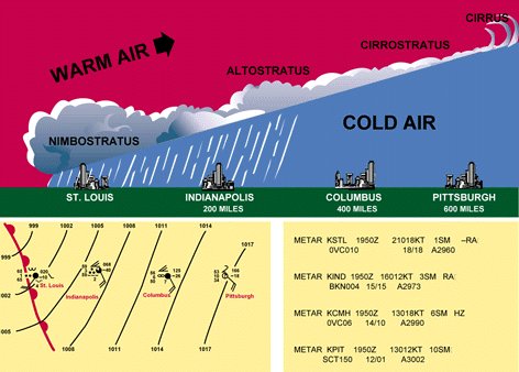 As the warm air progresses up the slope, with constantly falling temperatures, clouds appear at increasing heights in the form of altostratus and cirrostratus, if the warm air is stable. If the warm air is unstable, cumulonimbus clouds and altocumulus clouds will form and frequently produce thunderstorms. Finally, the air is forced up near the stratosphere, and in the freezing temperatures at that level, the condensation appears as thin wisps of cirrus clouds. The upslope movement is very gradual, rising about 1,000 feet every 20 miles. Thus, the cirrus clouds, forming at perhaps 25,000 feet altitude, may appear as far as 500 miles in advance of the point on the ground which marks the position of the front. [Figure 5-22] Flight Toward an Approaching Warm Front Although no two fronts are exactly alike, a clearer understanding of the general pattern may be gained if the atmospheric conditions which might exist when a warm front is moving eastward from St. Louis, MO, is considered. [Figure 5-22] At St. Louis, the weather would be very unpleasant, with drizzle and probably fog. At Indianapolis, IN, 200 miles in advance of the warm front, the sky would be overcast with nimbostratus clouds, and continuous rain. At Columbus, OH, 400 miles in advance, the sky would be overcast with stratus and altostratus clouds predominating. The beginning of a steady rain would be probable. At Pittsburgh, PA, 600 miles ahead of the front, there would probably be high cirrus and cirrostratus clouds. If a flight was made from Pittsburgh to St. Louis, ceiling and visibility would decrease steadily. Starting under bright skies, with unlimited ceilings and visibilities, lower stratus-type clouds would be noted as Columbus was approached, and soon afterward precipitation would be encountered. After arriving at Indianapolis, the ceilings would be too low for further flight. Precipitation would reduce visibilities to practically zero. Thus, it would be wise to remain in Indianapolis until the warm front had passed, which might require a day or two. If a return flight to Pittsburgh was made, it would be recommended to wait until the front had passed beyond Pittsburgh, which might require three or four days. Warm fronts generally move at the rate of 10 to 25 MPH. On the trip from Pittsburgh to Indianapolis, a gradual increase in temperature would have been noticed, and a much faster increase in dewpoint until the two coincided. Also the atmospheric pressure would gradually lessen because the warmer air aloft would have less weight than the colder air it was replacing. This condition illustrates the general principle that a falling barometer indicates the approach of stormy weather. When a cold front moves forward, it acts like a snow plow, sliding under the warmer air and forcing it aloft. This causes the warm air to cool suddenly and form cloud types that depend on the stability of the warm air. Fast-Moving Cold Fronts In fast-moving cold fronts, friction retards the front near the ground, which brings about a steeper frontal surface. This steep frontal surface results in a narrower band of weather concentrated along the forward edge of the front. If the warm air is stable, an overcast sky may occur for some distance ahead of the front, accompanied by general rain. If the warm air is conditionally unstable, scattered thunderstorms and showers may form in the warm air. At times an almost continuous line of thunderstorms may form along the front or ahead of it. These lines of thunderstorms (squall lines) contain some of the most turbulent weather experienced by pilots. Behind the fast-moving cold front, there is usually rapid clearing, with gusty and turbulent surface winds, and colder temperatures. Flight Toward an Approaching Cold Front If a flight was made from Pittsburgh toward St. Louis when a cold front was approaching from St. Louis, weather conditions quite different from those associated with a warm front would be experienced. The sky in Pittsburgh would probably be somewhat overcast with stratocumulus clouds typical of a warm air mass, the air smooth, and the ceilings and visibilities relatively low, although suitable for flight. [Figure 5-23] As the flight proceeded, these conditions would prevail until reaching Indianapolis. At this point, it would be wise to check the position of the cold front by reviewing current weather charts and reports. It would probably be found that the front was now about 75 miles west of Indianapolis. A pilot with sound judgment, based on knowledge of frontal conditions, would remain in Indianapolis until the front had passed -- a matter of a few hours -- and then continue to the destination under near perfect flying conditions.