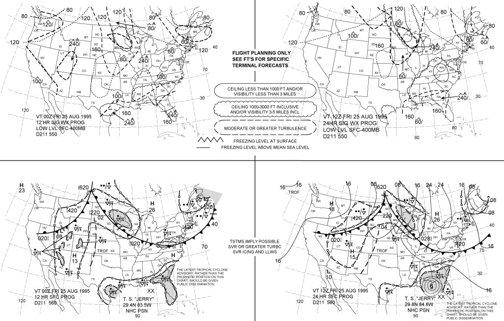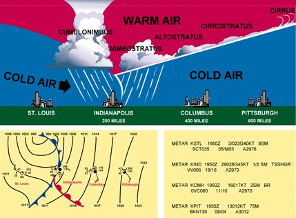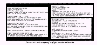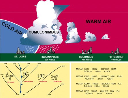 INTRODUCTION Despite all the technological advancements, safety in flight is still subject to weather conditions such as limited visibility, turbulence, and icing. One may wonder why pilots need more than general information available from the predictions of the meteorologist. The answer is well known to the experienced pilot. Meteorologists' predictions are based upon movements of large air masses and upon local conditions at points where weather stations are located. Air masses at times are unpredictable, and weather stations in some areas are spaced rather widely apart. Therefore, pilots must understand the conditions that could cause unfavorable weather to occur between the stations, as well as the conditions that may be different from those indicated by weather reports. Furthermore, the meteorologist can only predict the weather conditions; the pilot must decide whether the particular flight may be hazardous, considering the type of aircraft being flown, equipment used, flying ability, experience, and physical limitations. Weather service to aviation is a combined effort of the National Weather Service (NWS), the Federal Aviation Administration (FAA), the Department of Defense (DOD), and other aviation groups and individuals. Because of the increasing need for worldwide weather services, foreign weather services also have a vital input into our service. This chapter is designed to help the pilot acquire a general background of weather knowledge and the principles upon which sound judgment can be built as experience is gained and further study is undertaken. There is no substitute for experience in any flight activity, and this is particularly true if good judgment is to be applied to decisions concerning weather. OBSERVATIONS Weather observations are measurements and estimates of existing weather both at the surface and aloft. When recorded and transmitted, an observation becomes a report, and these reports are the basis of all weather analyses and forecasts. Surface Aviation Weather Observations Surface aviation weather observations include elements pertinent to flying. A network of airport stations provides routine up-to-date surface weather information. Automated surface observing systems (ASOS), automated weather observing systems (AWOS), and other automated weather observing systems are becoming a major part of the surface weather observing network. Upper Air Observations Upper air observations are data received from sounding balloons (known as radiosonde observations) and pilot weather reports (PIREPs). Upper air observations are taken twice daily at specified stations. These observations furnish temperature, humidity, pressure, and wind data. In addition, pilots are a vital source of upper air weather observations. In fact, aircraft in flight are the only means of directly observing turbulence, icing, and height of cloud tops. Radar Observation Precipitation reflects radar signals which are displayed as echoes on the radar scope. The use of radar is particularly helpful in determining the exact location of storm areas. Except for some mountainous terrain, radar coverage is complete over the contiguous 48 states. A radar remote weather display system (RRWDS) is specifically designed to provide real-time radar weather information from many different radars. A radar system that uses Doppler technology is being installed across the United States. This radar gives greater detail and enhanced information about thunderstorms and weather systems. SERVICE OUTLETS A weather service outlet as used here is any facility, either government or private, that provides aviation weather service to users. Information concerning some of the service outlets provided by the FAA follows. FAA Flight Service Station (FSS) The FAA flight service station provides more aviation weather briefing services than any other government service outlet. They provide preflight and inflight briefings, make scheduled and unscheduled weather broadcasts, and furnish weather advisories to flights within the FSS area. The FAA has modernized its FSS program. Automated flight service stations (AFSS) are becoming abundant, with about one per state, with lines of communications radiating out from it. Pilot's Automatic Telephone Weather Answering System (PATWAS) Pilot's automatic telephone weather answering system is a recorded telephone briefing with the forecast for the local area, usually within a 50 nautical mile radius of the station. Transcribed Information Briefing Service (TIBS) Transcribed information briefing service is provided by AFSS's and provides continuous telephone recordings of meteorological and/or aeronautical information. Specifically, TIBS provides area and/or route briefings, airspace procedures, and special announcements, if applicable. Other items may be included depending on user demand. Direct User Access Terminal Service (DUATS) A direct user access terminal service is an FAA-operated information system which enables pilots and other aviation interests to conduct their own weather briefings. The computer-based system receives and stores a number of NWS and FAA products which are commonly used in weather briefings. Pilots using a personal computer and modem can access the system and request weather and other pertinent data as well as file or amend flight plans. Transcribed Weather Broadcast (TWEB) A transcribed weather broadcast is a continuous broadcast on low/medium frequencies (190 to 535 kHz) and selected VORs (108.0 to 117.95 MHz). WEATHER BRIEFING Obtaining a good weather briefing is in the interest of safety. It is the pilot's responsibility to ensure all the needed information is obtained to make a safe flight. When requesting a briefing, pilots should identify themselves and provide as much information regarding the proposed flight as possible. The information received will depend on the type of briefing requested. The following would be helpful to the briefer.