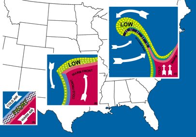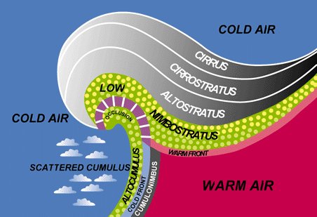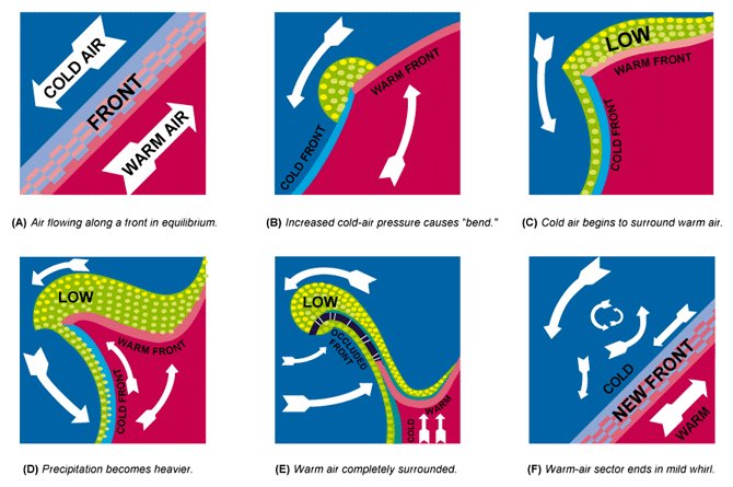 When two air masses meet, they will not mix readily unless their temperatures, pressures, and relative humidities are very similar. Instead, they set up boundaries called frontal zones, or fronts, the colder air mass projecting under the warmer air mass in the form of a wedge. This condition is termed a stationary front, if the boundary is not moving. Usually, however, the boundary moves along the Earths surface, and as one air mass withdraws from a given area, it is replaced by another air mass. This action creates a moving front. If warmer air is replacing colder air, the front is called warm; if colder air is replacing warmer air, the front is called cold. Warm Front When a warm front moves forward, the warm air slides up over the wedge of colder air lying ahead of it. Warm air usually has high humidity. As this warm air is lifted, its temperature is lowered. As the lifting process continues, condensation occurs, low nimbostratus and stratus clouds form, and drizzle or rain develops. The rain falls through the colder air below, increasing its moisture content so that it also becomes saturated. Any reduction of temperature in the colder air, which might be caused by upslope motion or cooling of the ground after sunset, may result in extensive fog.