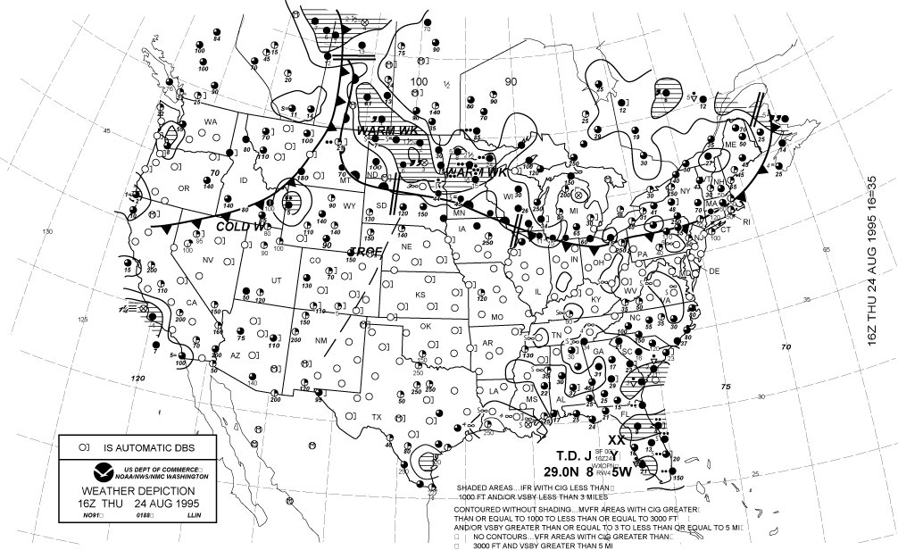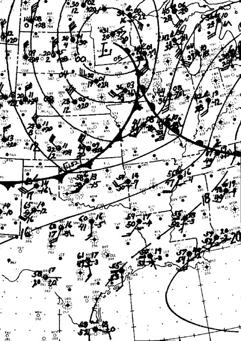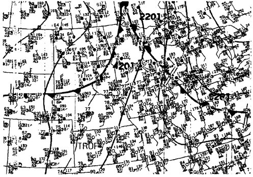 Figure 5-27 shows the development of the occluded front in greater detail. Figure 5-28 is an enlarged view of (C) in Figure 5-26, showing the cloud formations and the areas of precipitation. In figures 5-22, 5-23, and 5-25, a panel representing a surface weather map is placed below each cross-sectional view. These panels represent a bird's eye or plan view, and show how the weather conditions are recorded. A warm front is indicated by a red line, a cold front by a blue line, an occluded front by a purple line, and a stationary front by alternating red and blue dashes. The rounded and pointed projections are generally omitted from manuscript maps, but are placed on facsimile, printed, or duplicated maps to distinguish the different fronts. A frontal line on the weather map represents the position of the frontal surface on the Earth's surface. A pilot flying west at an altitude of 6,500 feet would pass through the frontal boundary about 100 miles in advance of the point where the warm front is shown, or about 25 to 50 miles to the rear of the line on the map representing the cold front. Figure 5-29 is a section of a surface weather map as transmitted on facsimile. It shows a low pressure center with warm, cold, and occluded fronts. The preceding discussion categorizes weather with types of fronts. However, weather with a front depends more on the characteristics of the conflicting air masses than on the type of front. A pilot should not attempt to determine expected weather from fronts and pressure centers on the surface chart alone. The pilot must rely heavily on other charts, reports, and forecasts which are discussed in the next section of this chapter. AVIATION WEATHER REPORTS, FORECASTS, AND WEATHER CHARTS A few reports and forecasts that are available to pilots were discussed briefly in previous portions of this chapter. This section will discuss these reports and forecasts in greater detail along with weather charts. Although pilots may often receive a telephone briefing, they should be able to read and interpret these reports, forecasts, and charts. Printed aviation data may be found at the National Weather Service Office, flight service stations, as well as reports generated through a direct user access terminal (DUAT) system. Although this section contains a great deal of information about reports, forecasts, and charts, for further information, reference should be made to AC 00-45 (latest revision), Aviation Weather Services, which is for sale by the Superintendent of Documents, U.S. Government Printing Office, Washington, DC 20402.