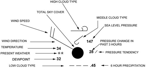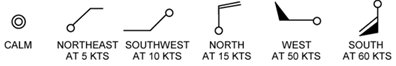 The pilot should be alert to the possibilities of low-level wind shear at any time the conditions stated are present. Wind and Pressure Representation on Surface Weather Maps The excerpted portion of a surface weather map provides information about winds at the surface. The wind direction at each station is shown by an arrow. The arrowhead is represented by the station circle, and points in the direction toward which the wind is blowing. Winds are given the name of the direction from which they blow; a northwest wind is a "wind blowing from the northwest." [Figure 5-16]