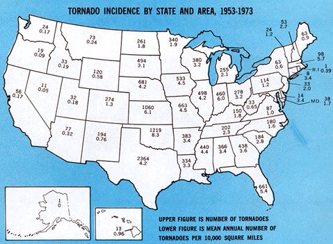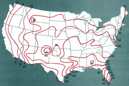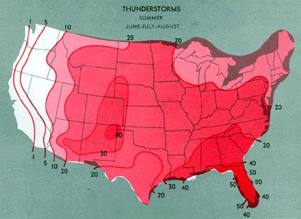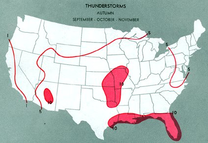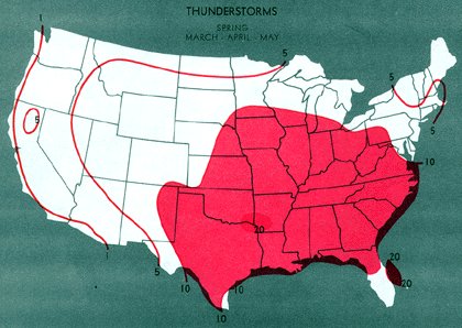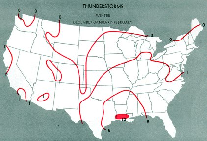Figure 100 shows the average number of thunderstorms each year in the adjoining 48 States. Note the frequent occurrences in the south-central and southeastern States. The number of days on which thunderstorms occur varies widely from season to season as shown in figures 101 through 104. In general, thunderstorms are most frequent during July and August and least frequent in December and January.