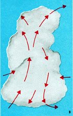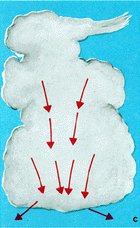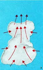 LIFE CYCLE A thunderstorm cell during its life cycle progresses through three stages - (1) the cumulus, (2) the mature, and (3) the dissipating. It is virtually impossible to visually detect the transition from one stage to another; the transition is subtle and by no means abrupt. Furthermore, a thunderstorm may be a cluster of cells in different stages of the life cycle. The Cumulus Stage Although most cumulus clouds do not grow into thunderstorms, every thunderstorm begins as a cumulus. The key feature of the cumulus stage is an updraft as illustrated in figure 105(A). The updraft varies in strength and extends from very near the surface to the cloud top. Growth rate of the cloud may exceed 3,000 feet per minute, so it is inadvisable to attempt to climb over rapidly building cumulus clouds.