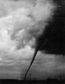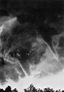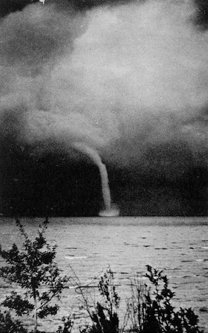 TORNADOES The most violent thunderstorms draw air into their cloud bases with great vigor. If the incoming air has any initial rotating motion, it often forms an extremely concentrated vortex from the surface well into the cloud. Meteorologists have estimated that wind in such a vortex can exceed 200 knots; pressure inside the vortex is quite low. The strong winds gather dust and debris, and the low pressure generates a funnel-shaped cloud extending downward from the cumulonimbus base. If the cloud does not reach the surface, it is a "funnel cloud," figure 109; if it touches a land surface, it is a "tornado," figure 107; if it touches water, it is a "water spout," figure 108.