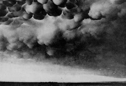 An aircraft entering a tornado vortex is almost certain to suffer structural damage. Since the vortex extends well into the cloud, any pilot inadvertently caught on instruments in a severe thunderstorm could encounter a hidden vortex. Families of tornadoes have been observed as appendages of the main cloud extending several miles outward from the area of lightning and precipitation. Thus, any cloud connected to a severe thunderstorm carries a threat of violence. Frequently, cumulonimbus mamma clouds occur in connection with violent thunderstorms and tornadoes. The cloud displays rounded, irregular pockets or festoons from its base and is a signpost of violent turbulence. Figure 110 is a photograph of a cumulonimbus mamma cloud. Surface aviation reports specifically mention this and other especially hazardous clouds.