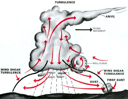 Hazardous turbulence is present in all thunderstorms; and in a severe thunderstorm, it can damage an airframe. Strongest turbulence within the cloud occurs with shear between updrafts and downdrafts. Outside the cloud, shear turbulence has been encountered several thousand feet above and 20 miles laterally from a severe storm. A low level turbulent area is the shear zone between the plow wind and surrounding air. Often, a "roll cloud" on the leading edge of a storm marks the eddies in this shear. The roll cloud is most prevalent with cold frontal or squall line thunderstorms and signifies an extremely turbulent zone. The first gust causes a rapid and sometimes drastic change in surface wind ahead of an approaching storm. Figure 113 shows a schematic cross section of a thunderstorm with areas outside the cloud where turbulence may be encountered.