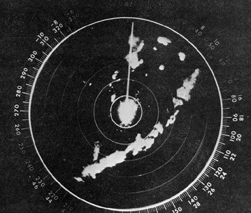 Meteorologists have shown that drop size is almost directly proportional to rainfall rate; and the greatest rainfall rate is in thunderstorms. Therefore, the strongest echoes are thunderstorms. Hailstones usually are covered with a film of water and, therefore, act as huge water droplets giving the strongest of all echoes. Showers show less intense echoes; and gentle rain and snow return the weakest of all echoes. Figure 115 is a photograph of a ground based radar scope.