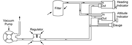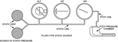 INTRODUCTION The use of instruments as an aid to flight enables the pilot to operate the airplane more precisely, and therefore, obtain maximum performance and enhanced safety. This is particularly true when flying greater distances. Manufacturers have provided the necessary flight instruments; however, it is the pilot' s responsibility to gain the essential knowledge about how the instruments operate so that they can be used effectively. This chapter covers the operational aspects of the pitot-static system and associated instruments: the vacuum system and associated instruments; and the magnetic compass. THE PITOT-STATIC SYSTEM AND ASSOCIATED INSTRUMENTS There are two major parts of the pitot-static system: (1) impact pressure chamber and lines; and (2) static pressure chamber and lines, which provides the source of ambient air pressure for the operation of the altimeter, vertical speed indicator (vertical velocity indicator), and the airspeed indicator. Impact Pressure Chamber and Lines In this system, the impact air pressure (air striking the airplane because of its forward motion) is taken from a pitot tube, which is mounted either on the leading edge of the wing or on the nose, and aligned to the relative wind. On certain aircraft, the pitot tube is located on the vertical stabilizer. These locations provide minimum disturbance or turbulence caused by the motion of the airplane through the air. The static pressure (pressure of the still air) is usually taken from the static line attached to a vent or vents mounted flush with the side of the fuselage. Airplanes using a flush-type static source, with two vents, have one vent on each side of the fuselage. This compensates for any possible variation in static pressure due to erratic changes in airplane attitude. The openings of both the pitot tube and the static vent should be checked during the preflight inspection to assure that they are free from obstructions. Clogged or partially clogged openings should be cleaned by a certificated mechanic. Blowing into these openings is not recommended because this could damage any of the three instruments. [Figure 3-1] As the airplane moves through the air, the impact pressure on the open pitot tube affects the pressure in the pitot chamber. Any change of pressure in the pitot chamber is transmitted through a line connected to the airspeed indicator which utilizes impact pressure for its operation. Static Pressure Chamber and Lines The static chamber is vented through small holes to the free undisturbed air, and as the atmospheric pressure increases or decreases, the pressure in the static chamber changes accordingly. Again, this pressure change is transmitted through lines to the instruments which utilize static pressure as illustrated in figure 3-1.